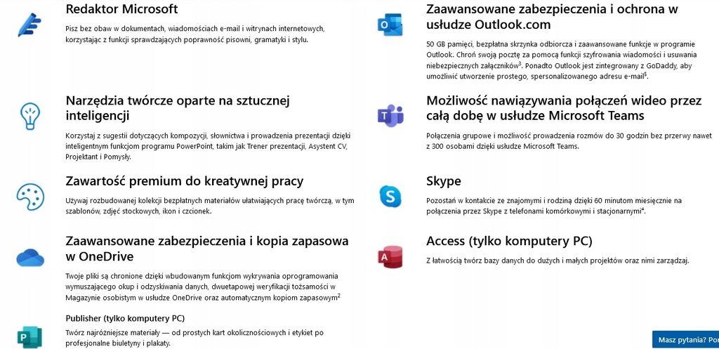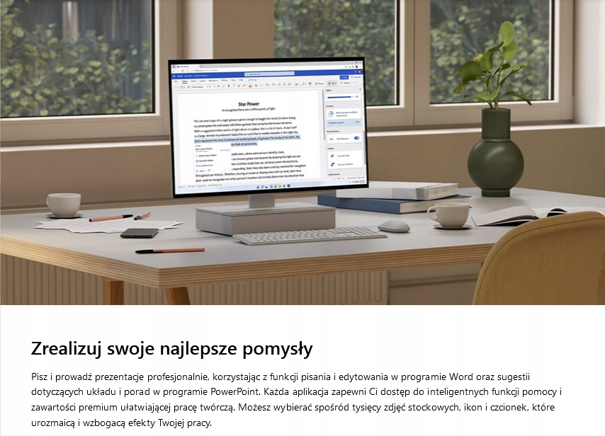 - Word, Excel, PowerPoint z dostępem w trybie offline i funkcjami premium.