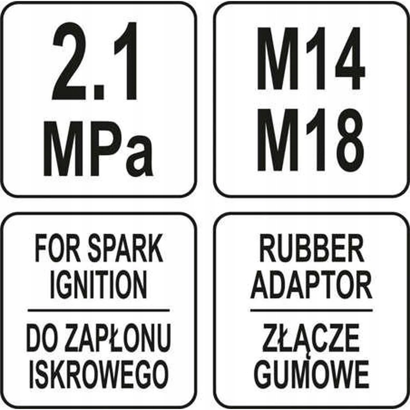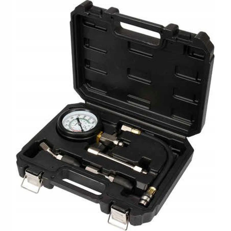 Pięcioczęściowy zestaw przeznaczony do pomiaru ciśnienia sprężania w silnikach z zapłonem iskrowym Polecany do serwisów samochodowych i mechanicznych.manometr o zakresie 300 psi (21 barów)dwie końcówki stożkowe gumowe, które uszczelniają gniazdo świecy zapłonowej, oraz końcówka wkręcana w gniazdo świecy (M14 i M18)zapakowany w poręczną walizkę**