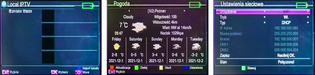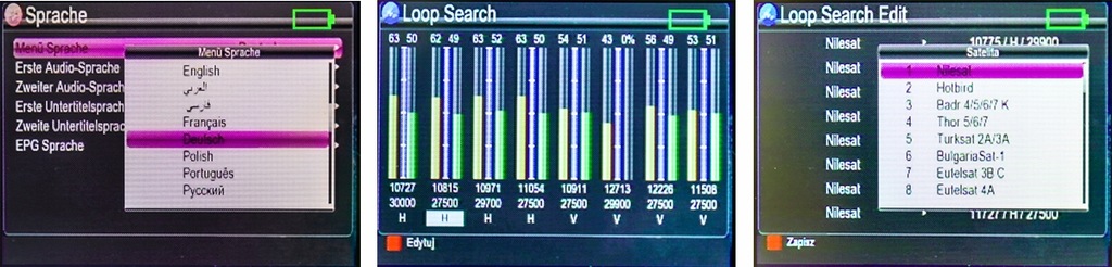 Wyjście i wejście: 1 szt. Gniazdo F, 1 szt. micro USB, 1 szt. Gniazdo 2.1/5.5 mm Wyświetlacz: 2.4 " TFT LCD Zakres częstotliwości: 950 MHz ... 2150 MHz - DVB-S / DVB-S2 / DVB-S2X Poziom sygnału: -25 ... -65 dBm Zasilanie konwertera: 13 / 18 V, 350 mA Przełączanie między pasmami: 0 / 22 kHz DiSEqC: Obsługa systemów DiSEqC 1.0, 1.1, 1.2, USALS Zasilanie anteny: Test sygnału wideo: Programowanie i aktualizacja oprogramowania: przez port micro USB Zasilanie bateryjne: Akumulator Li-Ion 7.4 V / 2500 mAh 12 V / 1 A (zasilacz w komplecie) Wybrane cechy: Pomiar siły i jakości sygnału Wskaźnik sygnału : Wyświetlacz LED / Sygnał dźwiękowy Pomiar BER, PWR, SNR Tryb pomiaru spektrum Obsługa obrotnicy anteny satelitarnej Wykres konstelacji Obsługa technologii UNICABLE Wsparcie funkcji wyszukiwania w pętli (podgląd sygnału jednocześnie na 8 częstotliwościach) Dźwiękowe powiadomienie z blokadą sygnału Czytelny i przejrzysty interfejs graficzny Menu ekranowe całkowicie w języku polskim Długi czas czuwania Niskie zużycie energii Kompas Wbudowana latarka Podświetlane przyciski Silikonowe antywstrząsowe etui Waga: 0.29 kg Wymiary: 166 x 94 x 41 mm Obsługiwane języki: polski, angielski, francuski, hiszpański, niemiecki, portugalski, rosyjski, włoski Producent / Marka: Spacetronik Gwarancja: 2 lata