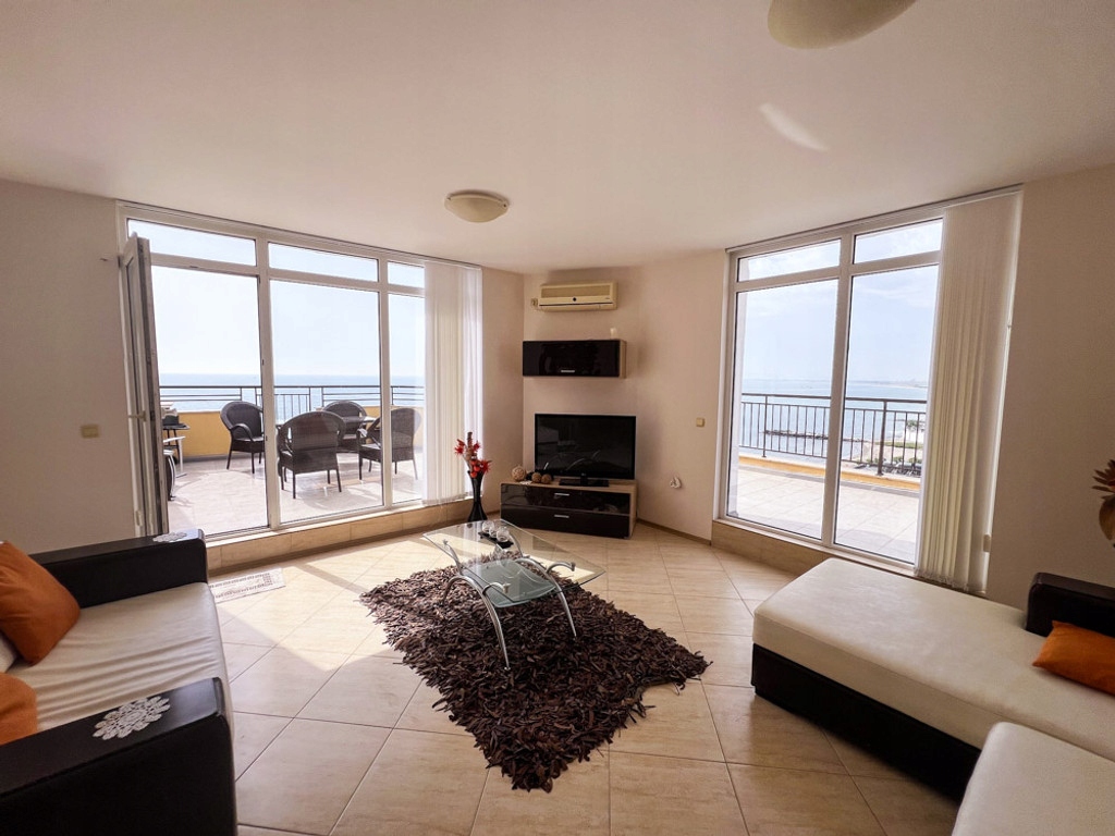 Mieszkanie jest w doskonałym stanie, jest w pełni umeblowane i wyposażone. Ma powierzchnię całkowitą 125,48 mkw. z czego 52 mkw. taras z przepięknym widokiem. Mieszkanie składa się z dużego salonu z kuchnią i jadalnią, jednej sypialni, dużego balkonu z bezpośrednim widokiem na morze oraz łazienki z prysznicem, toaletą i umywalką. Mieszkanie jest klimatyzowane i oferowane do sprzedaży z całym umeblowaniem i sprzętem AGD.