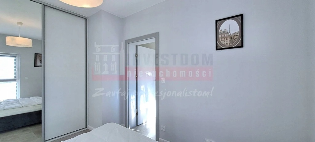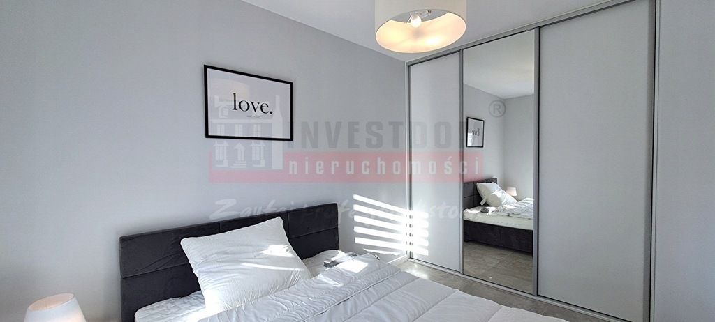 Sypialni z wygodnym łóżkiem, nowym materacem i pojemną szafą w zabudowie na całą ścianę.
