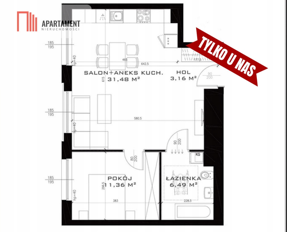 - salon z aneksem kuchennym 31,48 m2;
