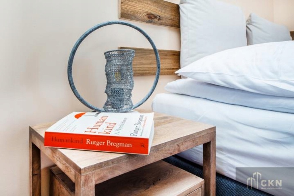 Wyposażenie: Sypialnia: podwójne łóżko, pościel, stół z krzesłami, telewizor LCD, szafa. Kuchnia: aneks kuchenny z kuchenką, piekarnikiem z mikrofalą, zmywarką, ekspresem do kawy, lodówką, czajnikiem, naczyniami kuchennymi oraz bezprzewodowym odkurzaczem. Łazienka: prysznic, suszarka do włosów, ręczniki, mydło.