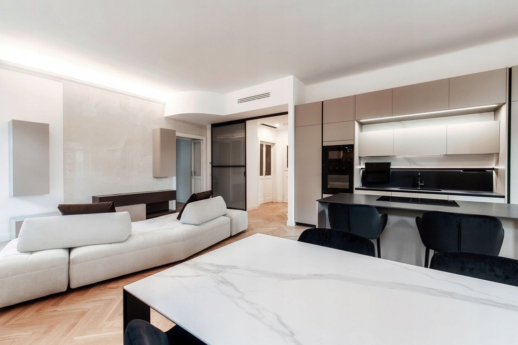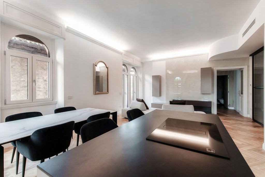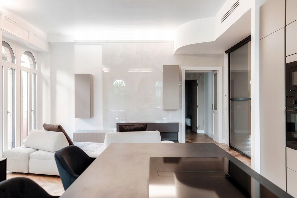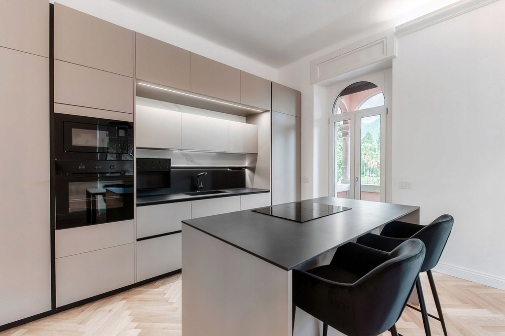 Kuchnia, charakteryzująca się istotnymi liniami i wyrafinowanymi materiałami, jest doskonale zintegrowana z otoczeniem, zaprojektowana tak, aby łączyć estetykę i funkcjonalność.