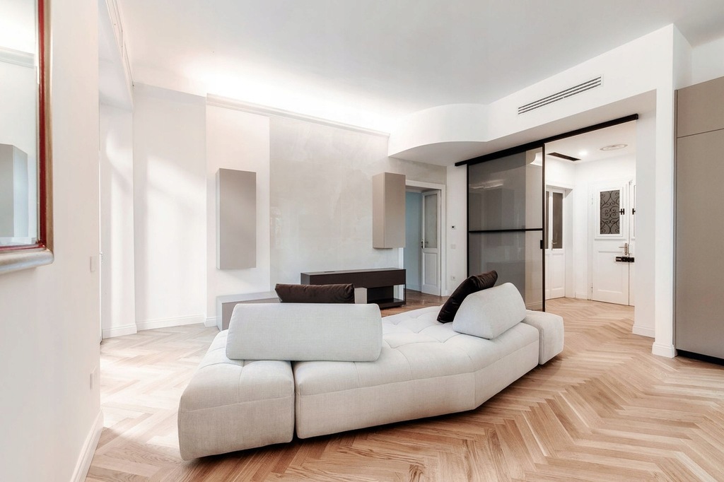 Część sypialna składa się z dwóch przestronnych dwuosobowych sypialni i dwóch wyrafinowanych łazienek, w których zwrócono uwagę na najdrobniejsze szczegóły z drobnymi materiałami, parkietem z naturalnego drewna i ręcznie wykonanymi boiserie.
