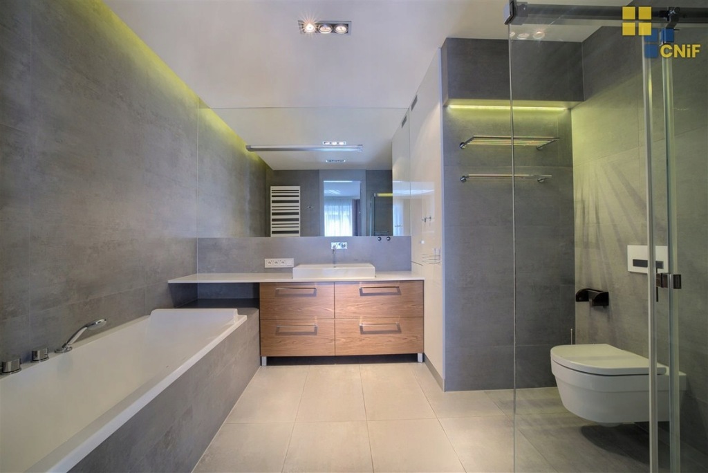 Duża łazienka pozwala na komfortowe rozwiązanie jakim jest umieszczenie zarówno wanny jak i prysznica.