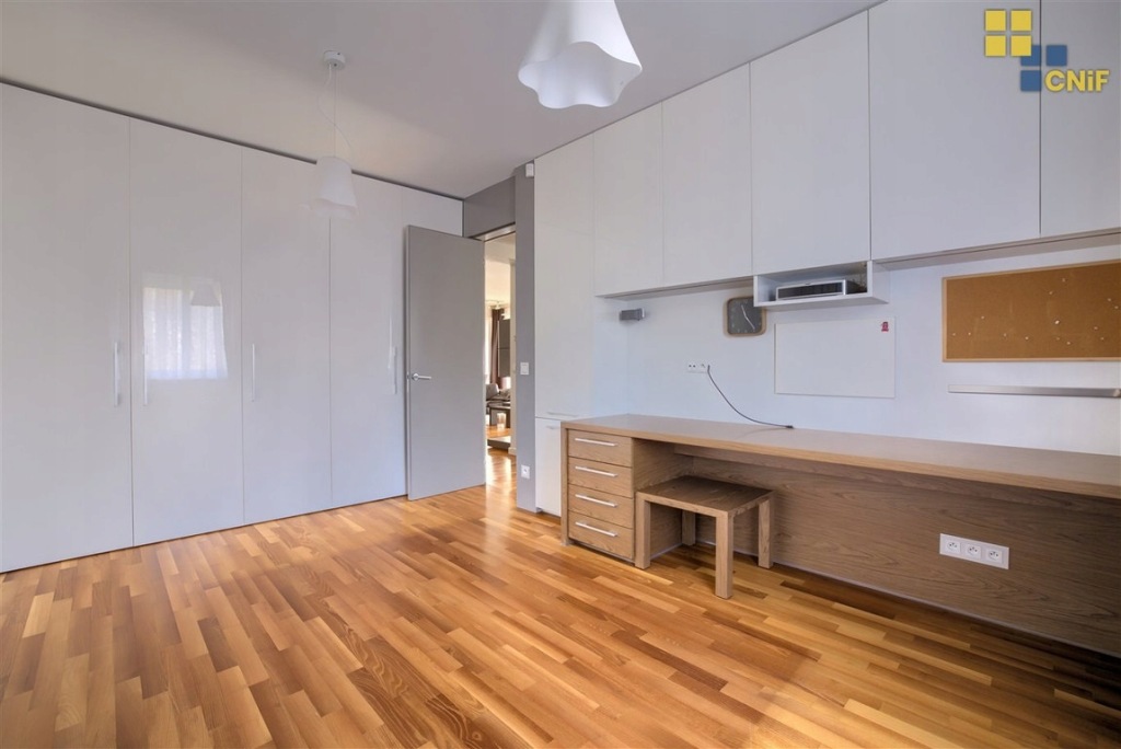 Wszystkie pomieszczenia w apartamencie posiadają zabudowę na wymiar, która jest praktycznym i zarazem oszczędnym rozwiązaniem przestrzennym. Pojemne szafy w sypialniach oraz w holu prezentują się estetycznie i nie przytłaczają pomieszczeń mimo sporych rozmiarów - wszystko dzięki temu, że są praktycznie niezauważalne.