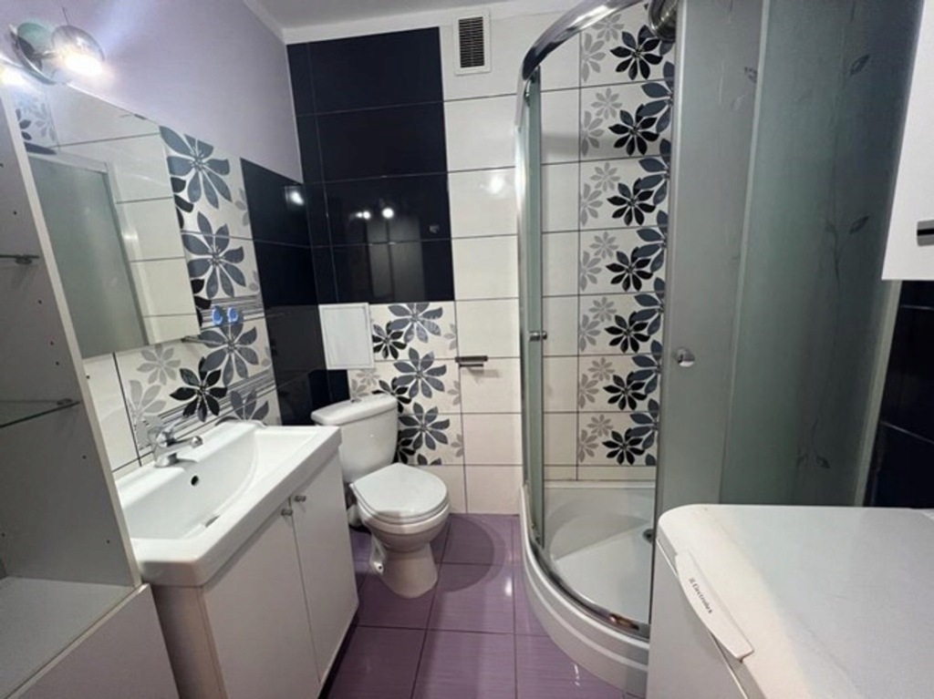 *Łazienka z WC: prysznic, umywalka, szafka, lustro, pralka.