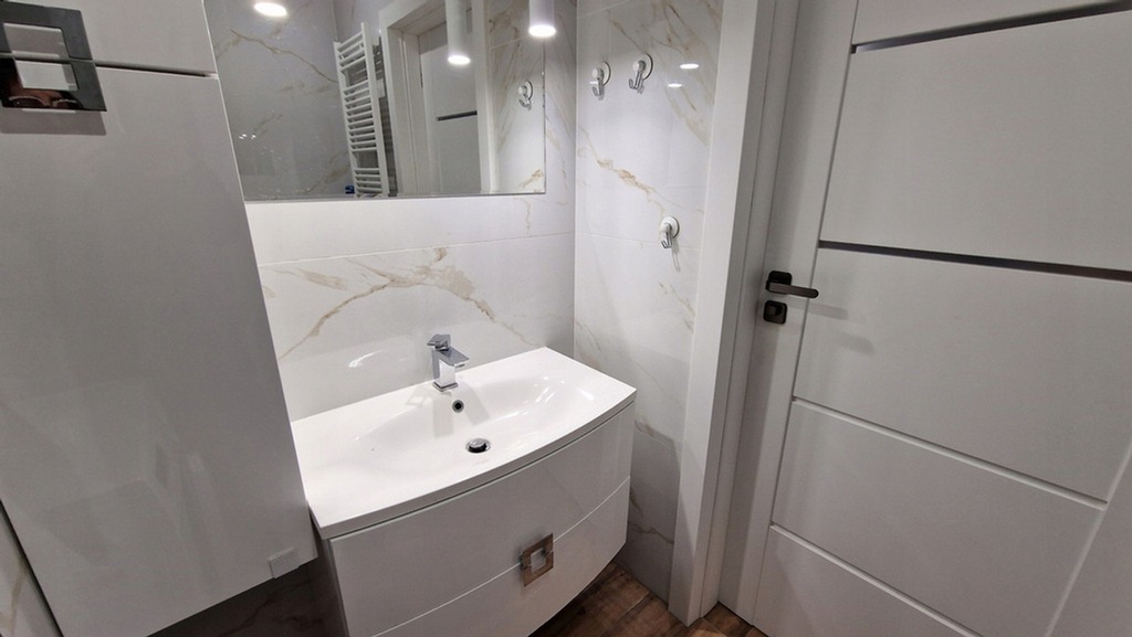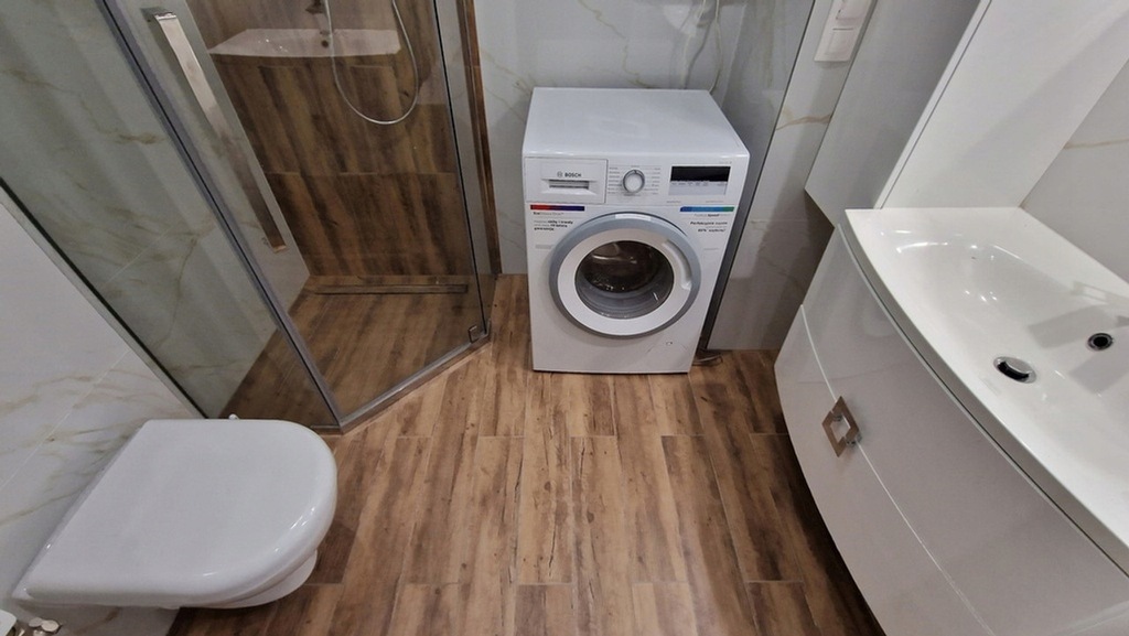 - ŁAZIENKA: duża kabina prysznicowa, pralka, WC, półka wisząca