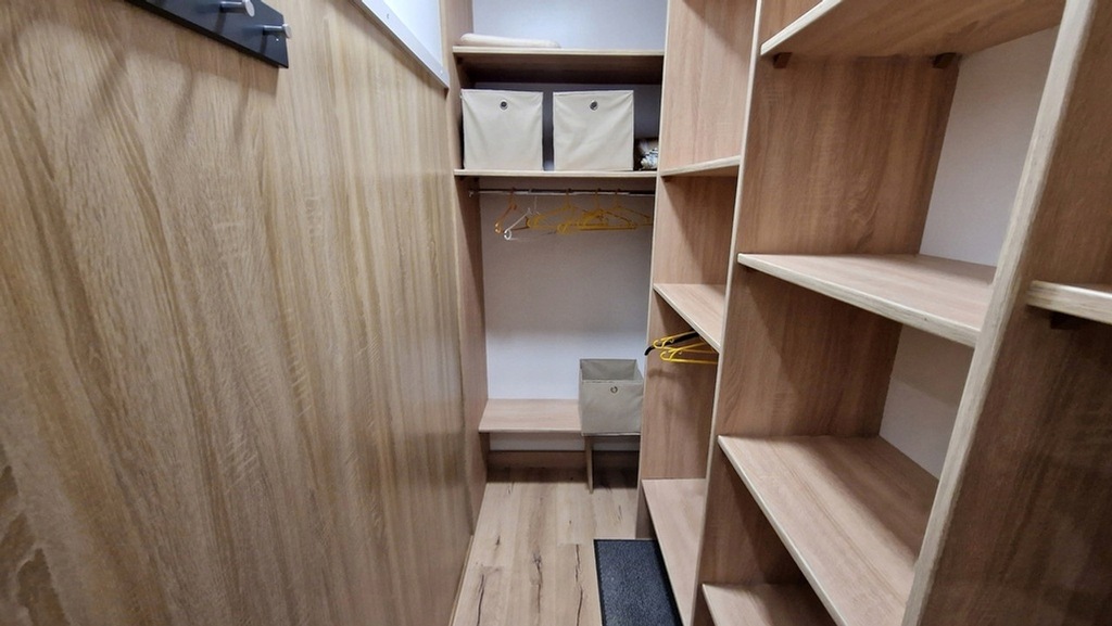 - PRZEDPOKÓJ: wieszak na odzież wierzchnią z wygodnym siedziskiem i szafkami na buty.