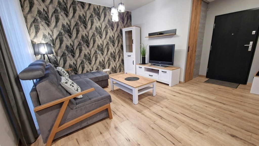 - SALON: duży komfortowy narożnik z funkcją spania stolik kawowy, komoda i szafka RTV. W oknach zasłony