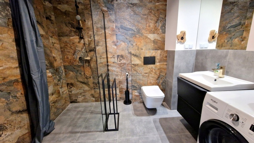 ŁAZIENKA: duży prysznic, toaleta, szafka z umywalką, pralka