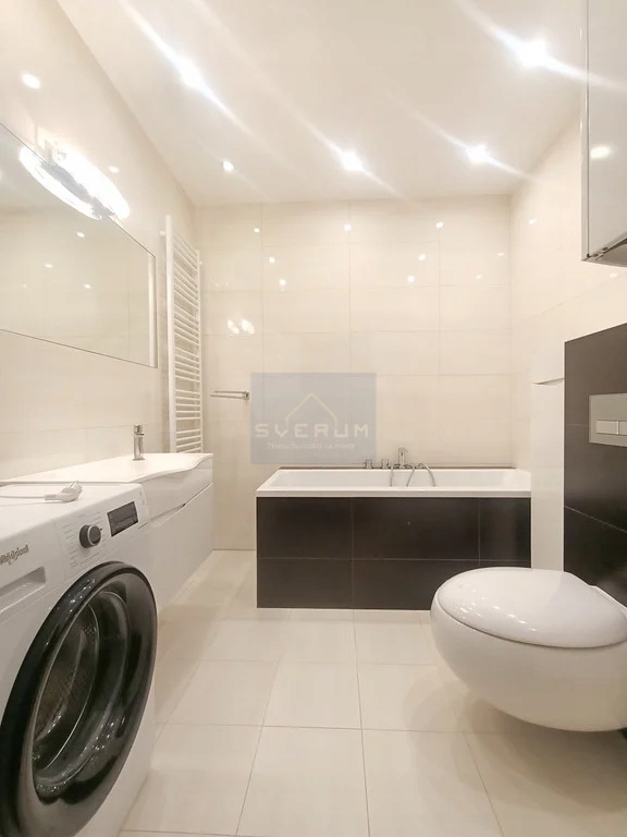 Łazienka: wanna, szafka z umywalką, wc-zestaw, pralka