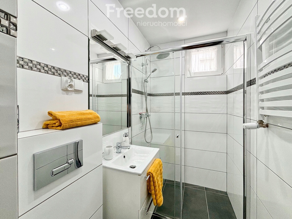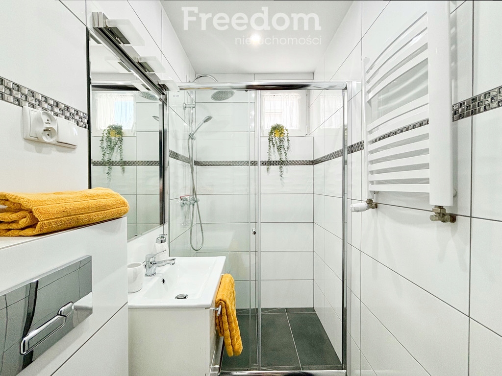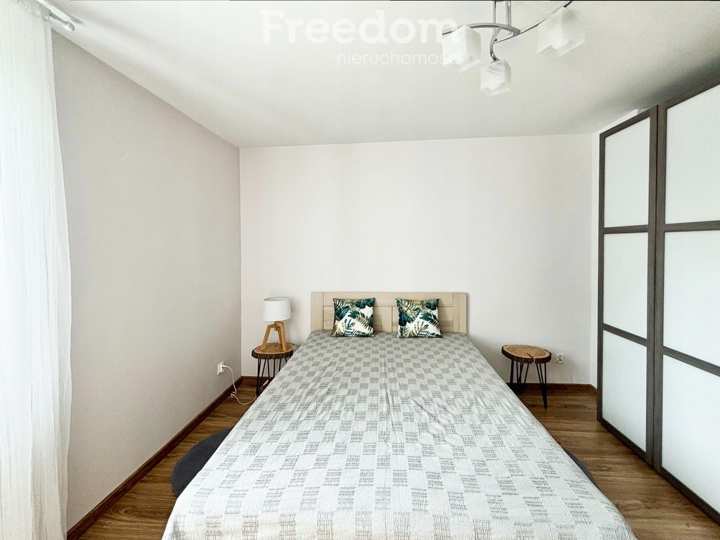 Zachodnia wystawa okienna sprawia, że mieszkanie jest doskonale nasłonecznione. W sypialni znajduje się duże łóżko, pojemna szafa i komoda. W łazience znajduje się kabina prysznicowa, umywalka i wc.