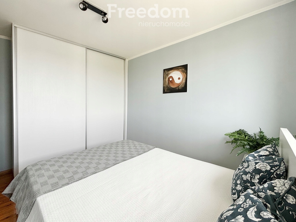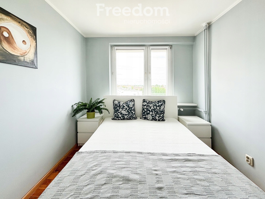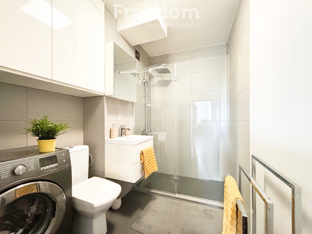 Południowa wystawa okienna sprawia, że mieszkanie jest doskonale nasłonecznione. W sypialni znajduje się duże łóżko i szafa w zabudowie. W łazience znajduje się kabina prysznicowa, umywalka i wc oraz pralka.