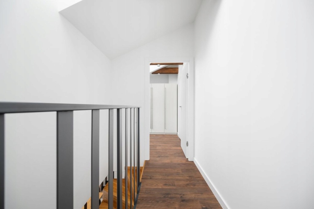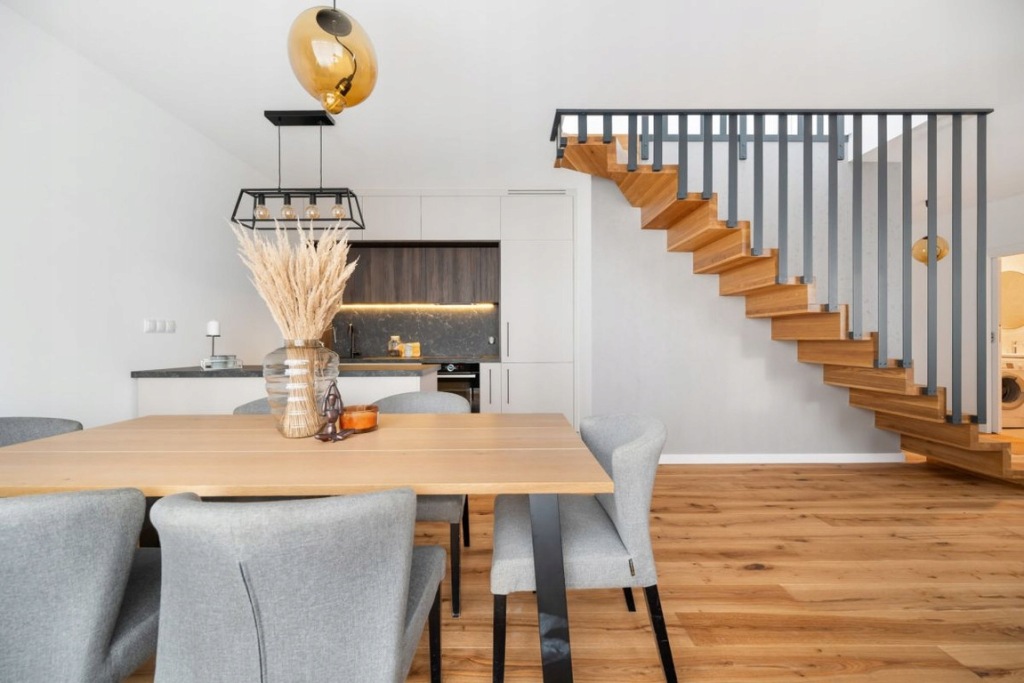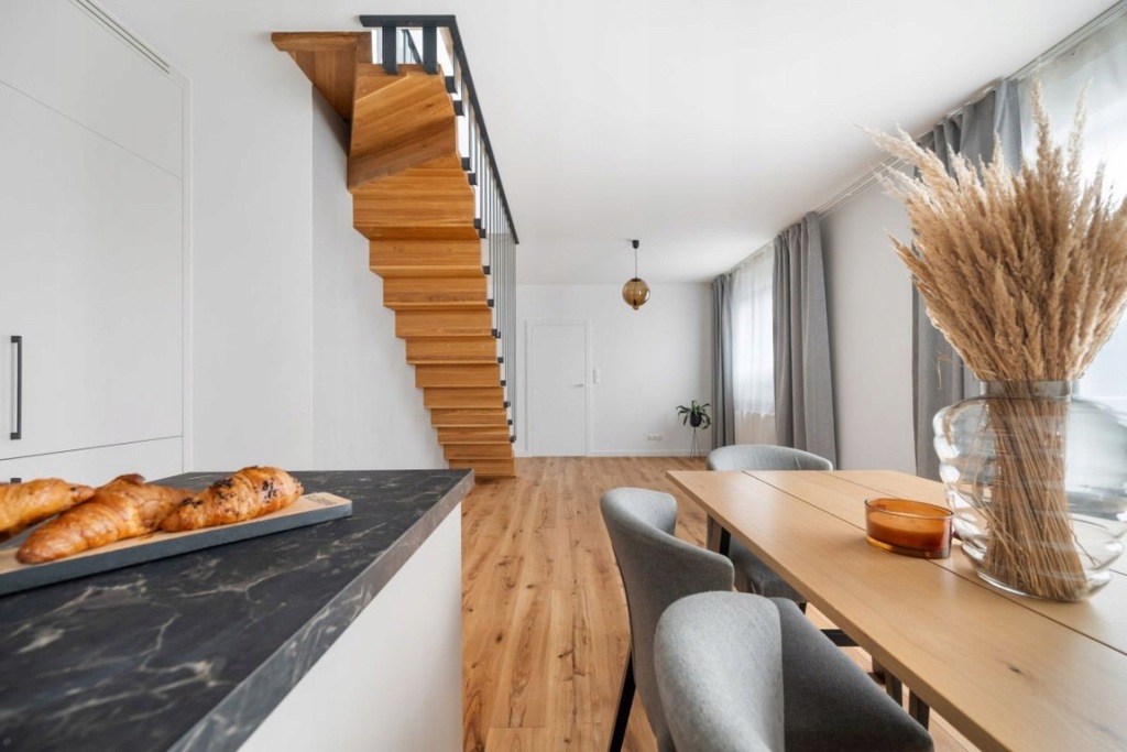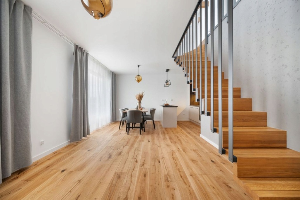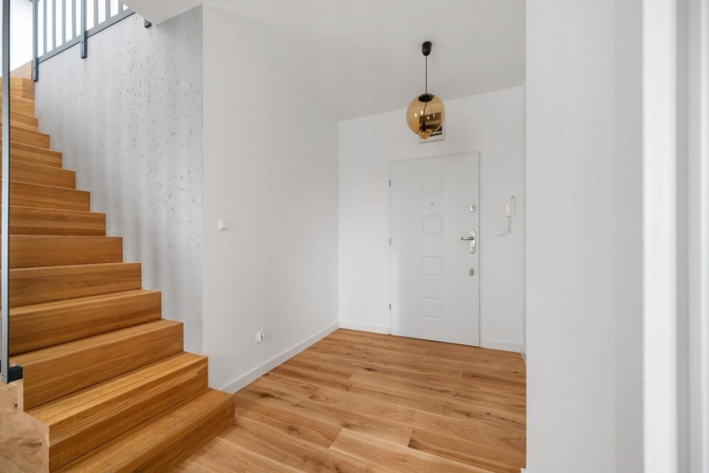 Zabudowa meblowa aneksu kuchennego została wykonana na wymiar przez stolarza, na systemach firmy Blum, z akrylowymi frontami. Zastosowano wysokiej jakości sprzęty AGD marki Bosch. Podłoga na parterze wykonana z deski dębowej, dwuwarstwowej, olejowanej, a na piętrze z paneli podłogowych o wysokim standardzie. Na piętro prowadzą drewniane schody z nowoczesnymi metalowymi barierkami. W całym mieszkaniu zamontowane są drzwi bezprzylgowe, lakierowane firmy Barański. Łazienki wyposażone w armaturę marki Hansgrohe, stelaże WC Geberit oraz lustra z oświetleniem LED. W łazience głównej znajduje się duża wanna, a w pozostałych - kabina prysznicowa z deszczownicą. W oknach na dolnym poziomie zamontowano plisy, natomiast w oknach dachowych rolety.