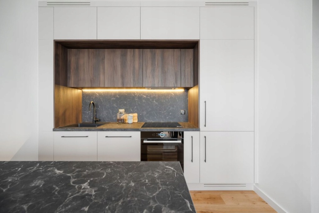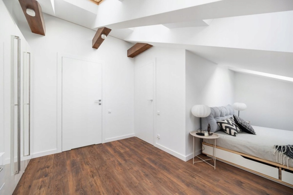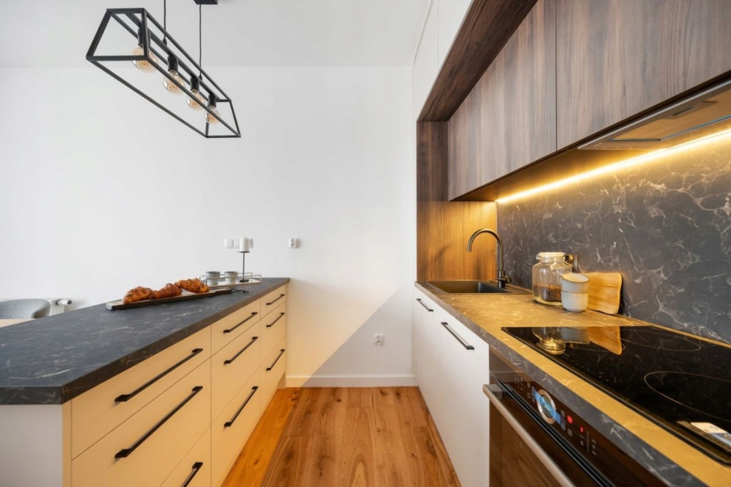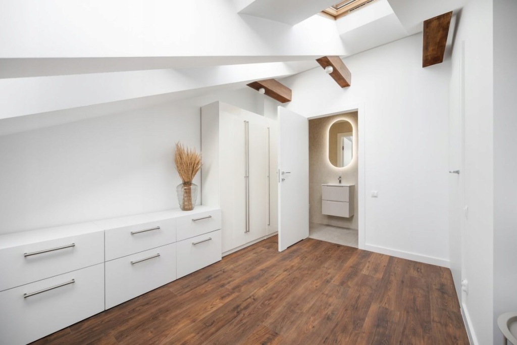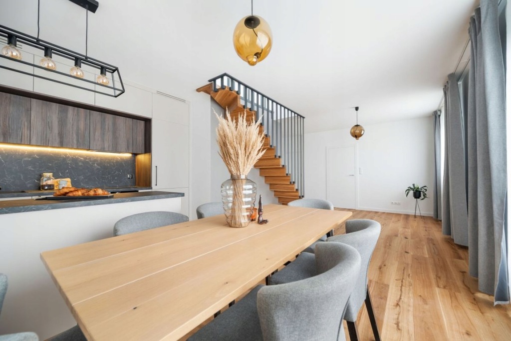 Zabudowa meblowa aneksu kuchennego została wykonana na wymiar przez stolarza, na systemach firmy Blum, z akrylowymi frontami. Zastosowano wysokiej jakości sprzęty AGD marki Bosch. Podłoga na parterze wykonana z deski dębowej, dwuwarstwowej, olejowanej, a na piętrze z paneli podłogowych o wysokim standardzie. Na piętro prowadzą drewniane schody z nowoczesnymi metalowymi barierkami. W całym mieszkaniu zamontowane są drzwi bezprzylgowe, lakierowane firmy Barański. Łazienki wyposażone w armaturę marki Hansgrohe, stelaże WC Geberit oraz lustra z oświetleniem LED. W łazience głównej znajduje się duża wanna, a w pozostałych - kabina prysznicowa z deszczownicą. W oknach na dolnym poziomie zamontowano plisy, natomiast w oknach dachowych rolety.