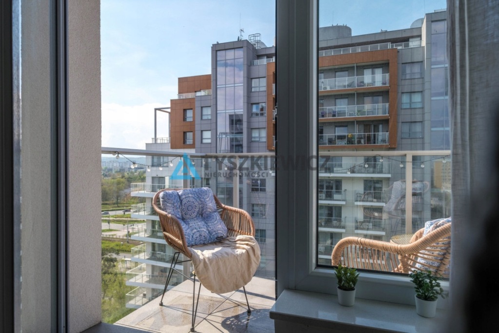 Mieszkanie posiada balkon o powierzchni ok. 9 m2 z zachodnią ekspozycją i niesamowitym widokiem na morze i panoramę Trójmiasta.