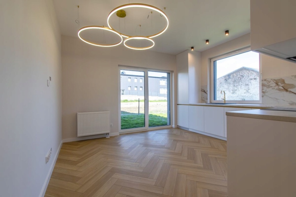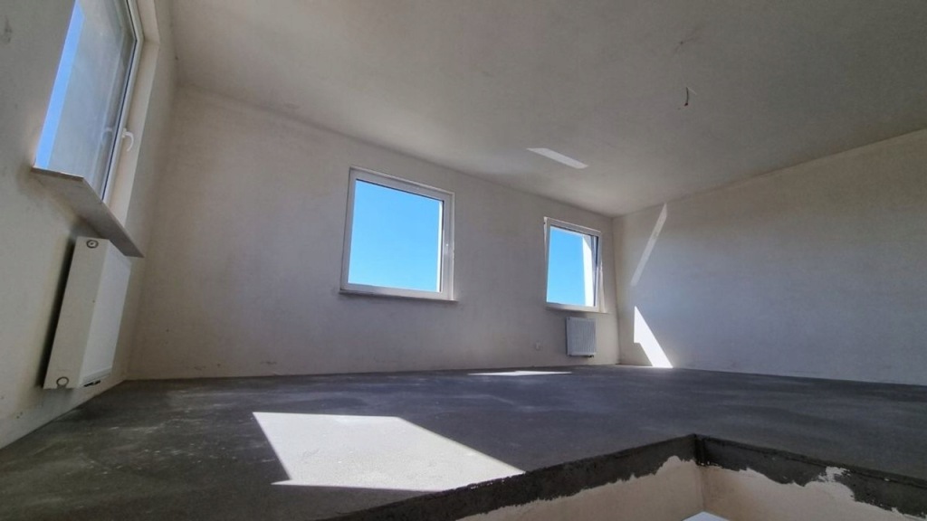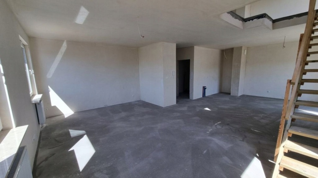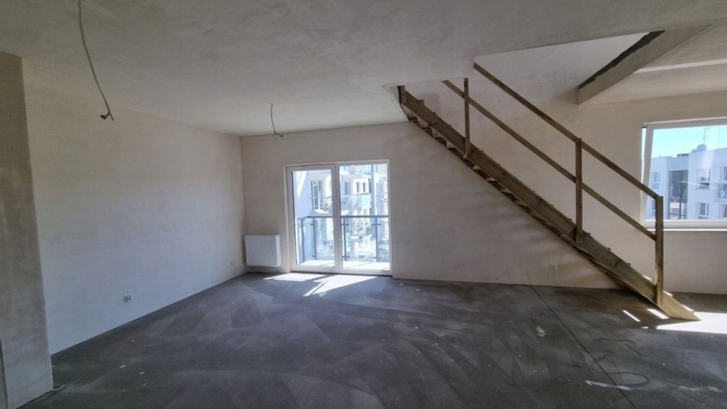 Mieszkanie w stanie deweloperskim wyróżnia się dużym salonem z aneksem kuchennym oraz miejscem na gabinet na I poziomie oraz 2ma lub 3ma sypialniami na piętrze bez skosów.