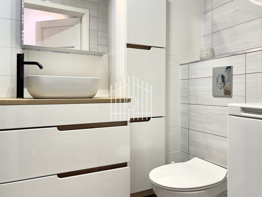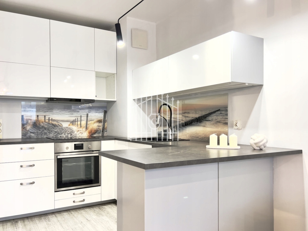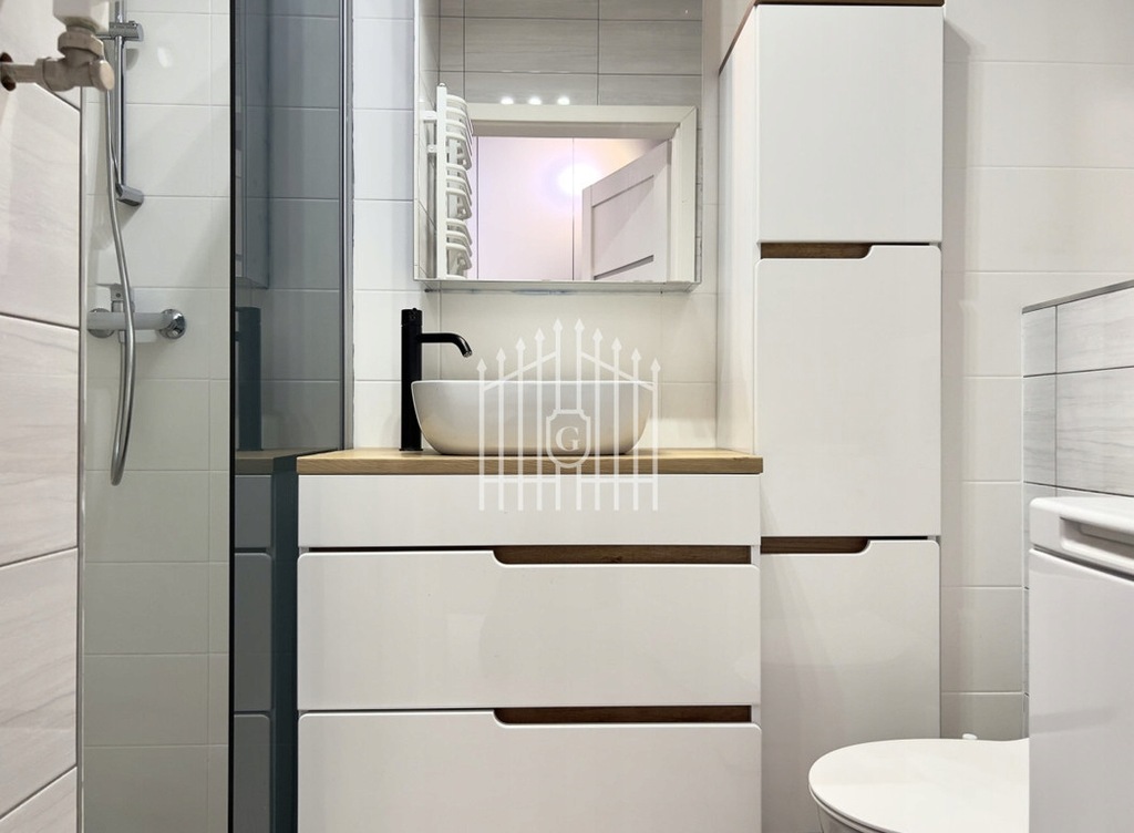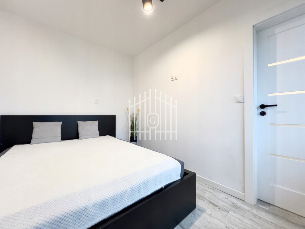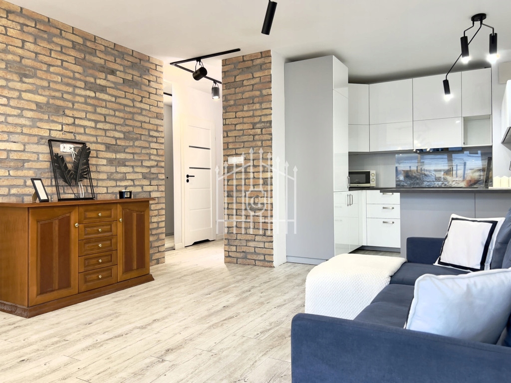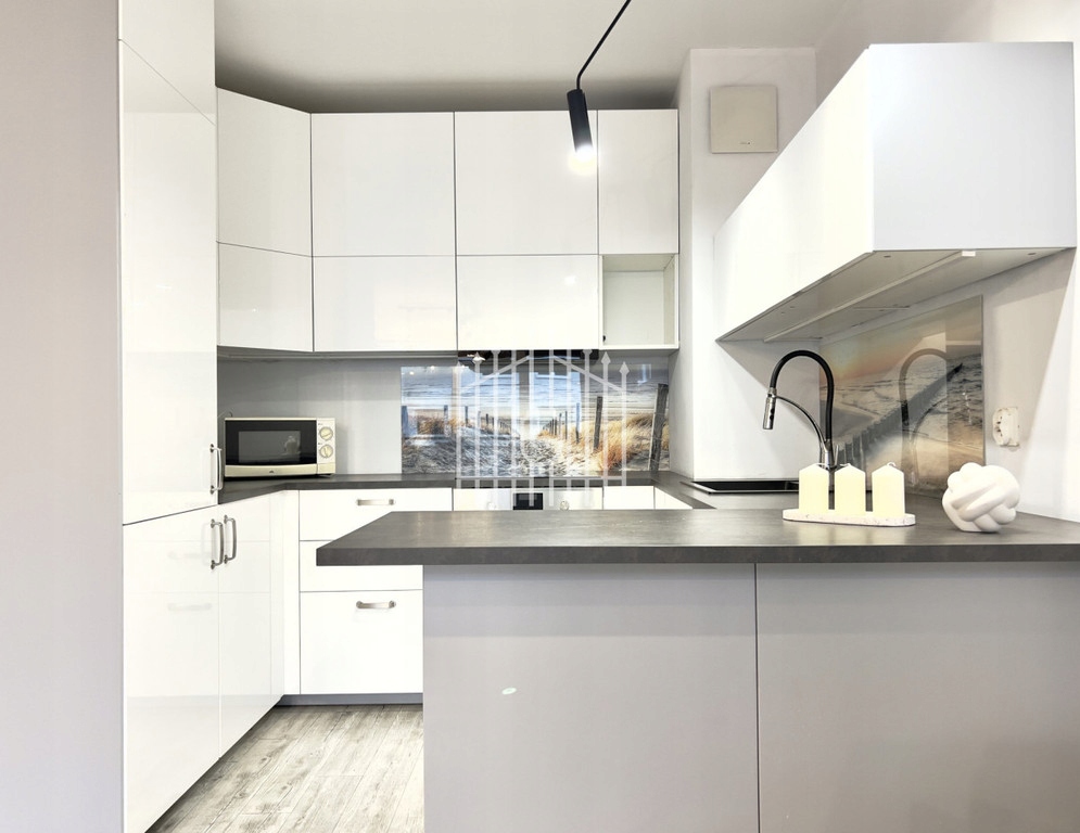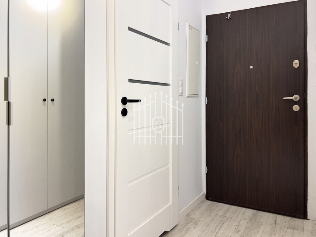 W skład mieszkania wchodzi salon z aneksem kuchennym, sypialnia, łazienka z kabiną prysznicową, przedpokój oraz balkon. W pokoju dziennym znajduje się kanapa z funkcją spania, stół z 3 krzesłami oraz komoda. Aneks kuchenny wyposażony jest w lodówkę, zmywarkę, płytę ceramiczną, mikrofalę, czajnik elektryczny. W sypialni znajduje się wygodne łóżko. W łazience mieści się kabina prysznicowa, pralka, szafka pod umywalkę i szafka ścienna oraz WC. W przedpokoju znajdują się dwie pojemne szafy w zabudowie.