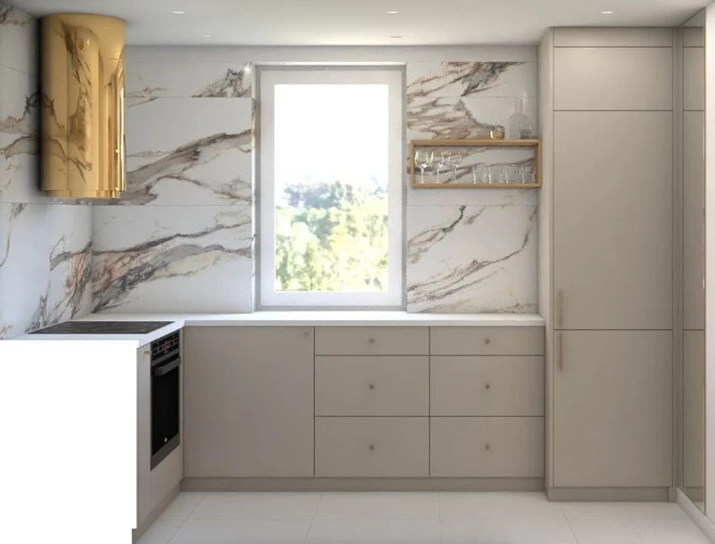 Kuchnia oddzielna w zabudowie wyposażona w kuchnię indukcyjną, piekarnik, okap.
