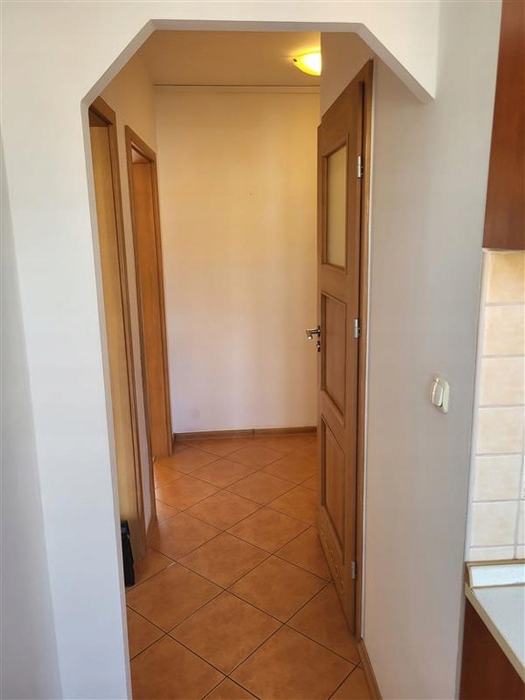 Na podłogach w pokojach panele, w przedpokoju, kuchni i łazience kafle.