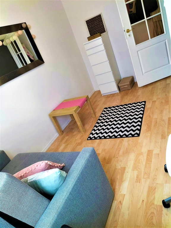 - drugiego pokój z małą garderobą mieszczącą się w ścianie za lustrem;