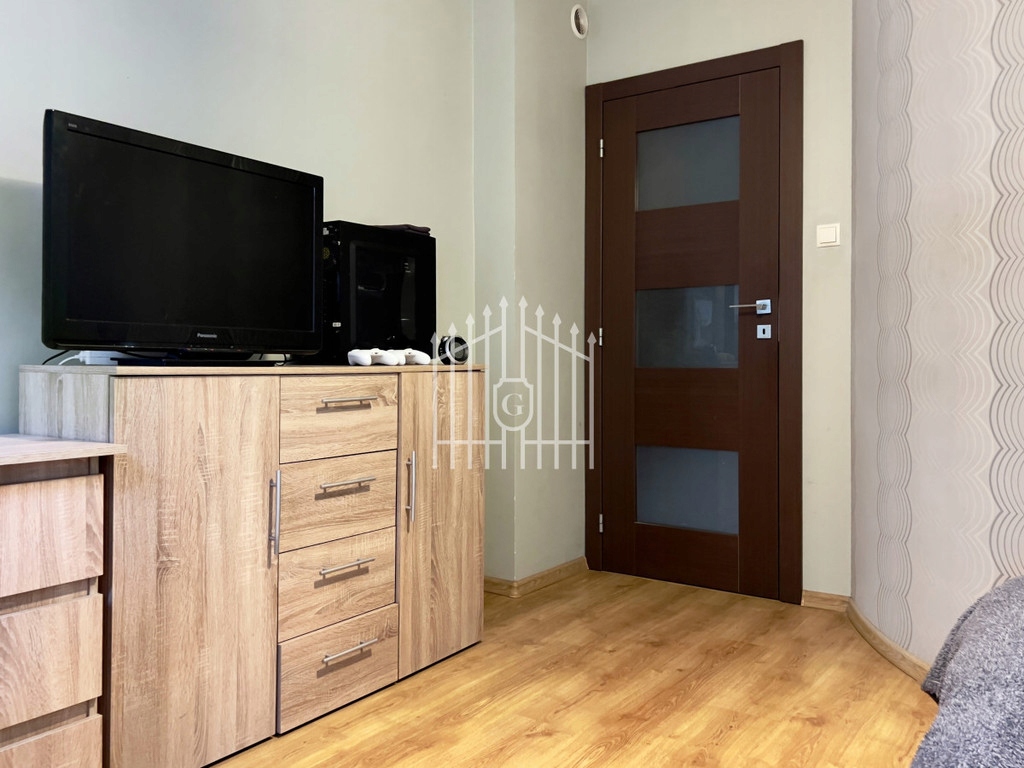 Na podłodze w dwóch pokojach położone są panele, w sypialni - wykładzina, a w łazience, kuchni i przedpokoju znajdują się kafle.