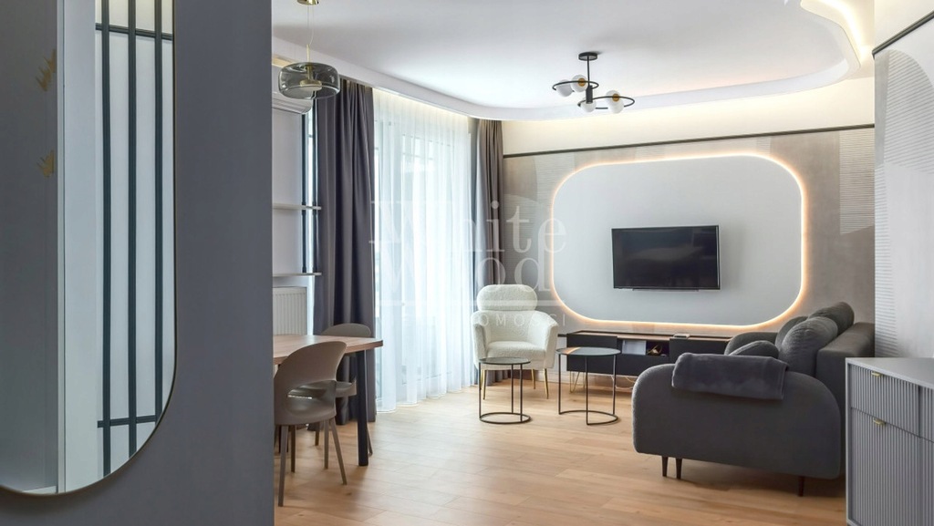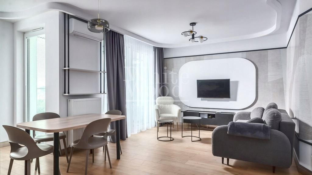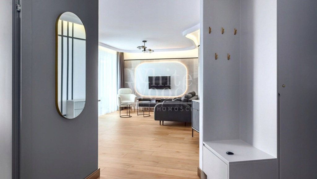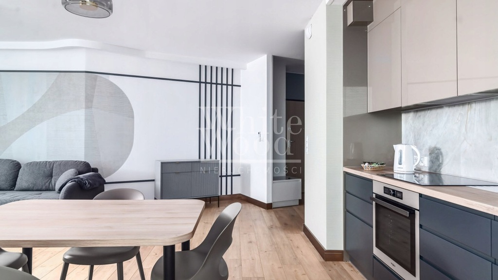 W pełni urządzony apartament o powierzchni 54,06m2 znajduje się na 10 piętrze i składa się z salonu z aneksem kuchennym z wyjściem na loggie, niezależnej sypialni, łazienki z prysznicem oraz korytarza. Wysokiej jakości sprzęty AGD, meble oraz zabudowa stała wykonana na wymiar pozostają w ramach ceny. Na podłogach wodoodporne panele. W salonie oraz w sypialni klimatyzacja.