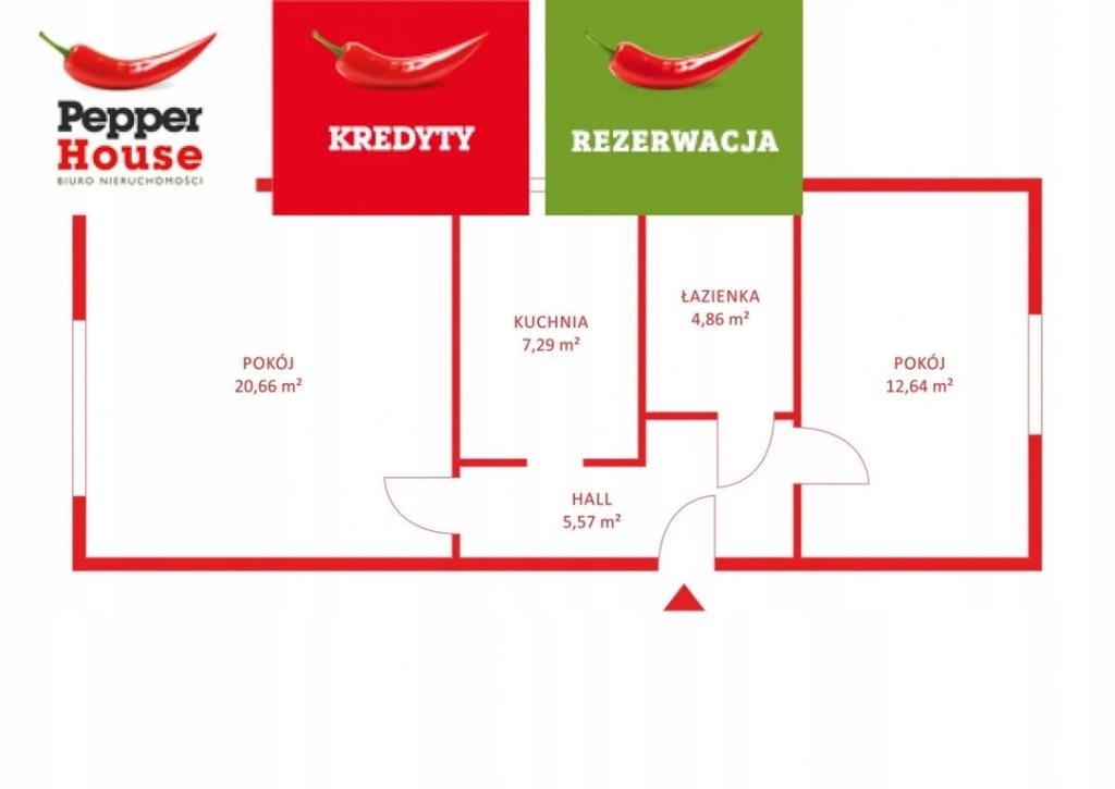 W skład mieszkania wchodzą: dwa niezależne pokoje o powierzchni (20,66m2/12,64); oddzielna jasna kuchnia (7,29m2); łazienka z kabiną prysznicową +WC (4,86) oraz przedpokój (5,57m2)
