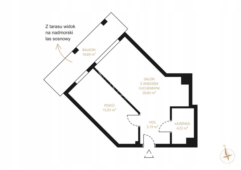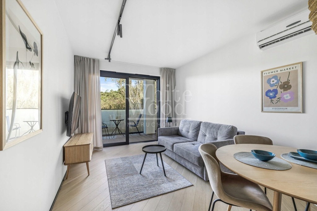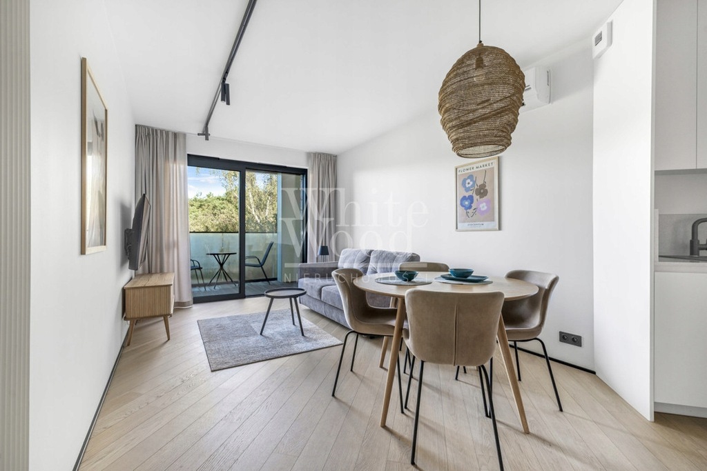 Koncepcja aranżacji tego wnętrza to stworzenie świetnego wypoczynku dla rodziny bądź przyjaciół. W apartamencie znajduje się przestronny salon z aneksem kuchennym, sypialnia z łóżkiem małżeńskim, łazienka z prysznicem walk in, duży taras, z którego widzimy sosnowy las - ściana zieleni.