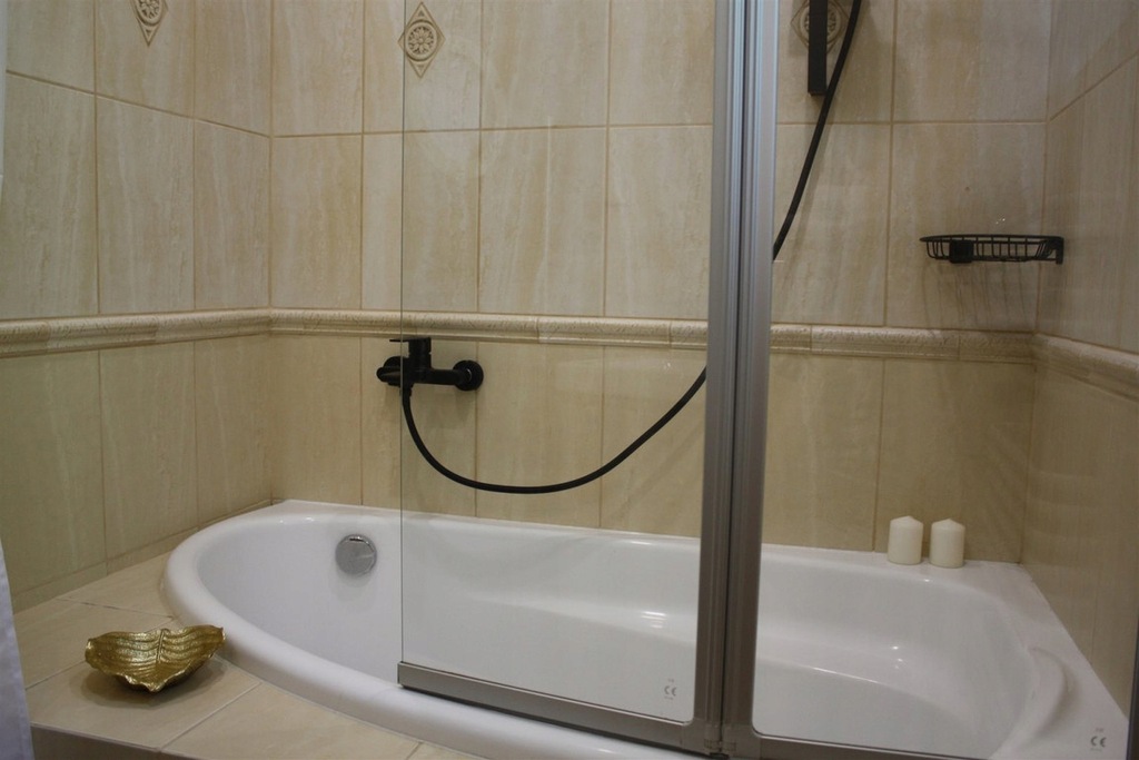 Łazienka wyposażona w wannę, umywalkę, toaletę.