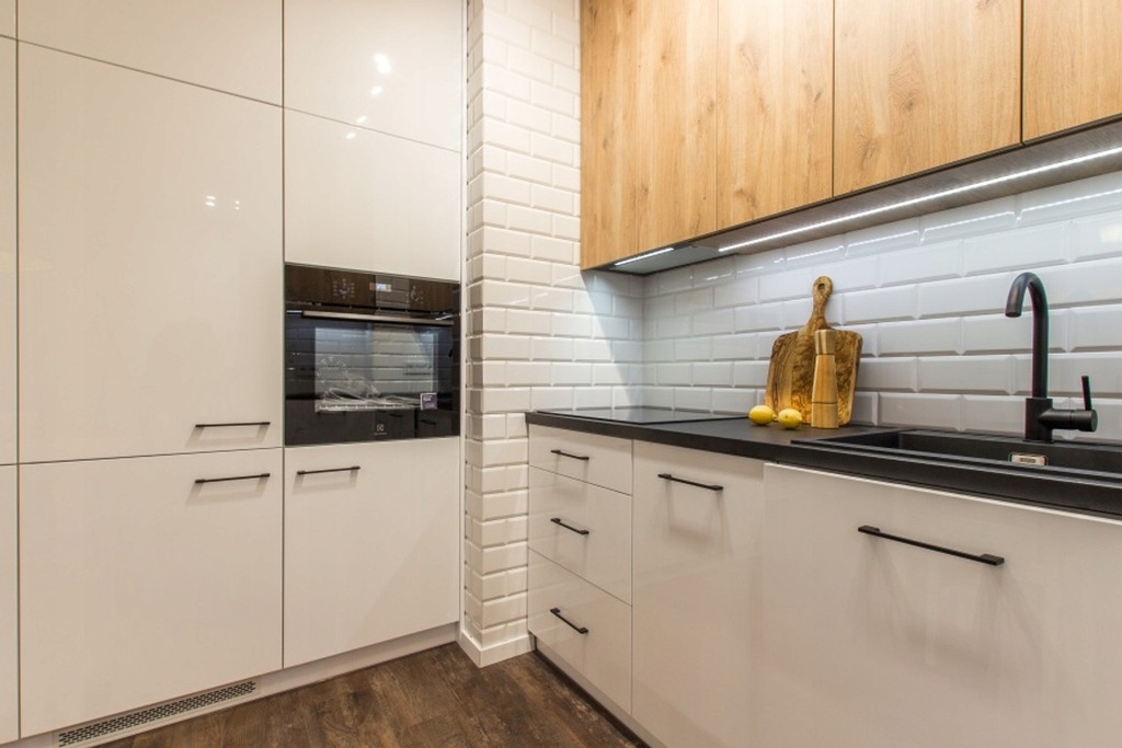 kuchnia wyposażona w sprzęt AGD wysokiej jakości: lodówka, zamrażarka, płyta indukcyjna, piekarnik i zmywarka,