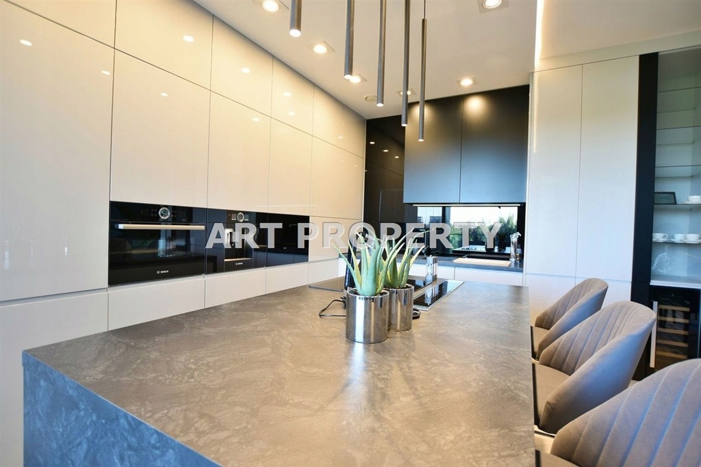 * kuchnia: pełna zabudowa kuchenna na wymiar wraz z wyspą: wysokiej jakości sprzęt: lodówka, zmywarka, piekarnik, płyta indukcyjna, ekspres do kawy, lodówka na wina; kompletne wyposażenie kuchni tkj: sztućce, garnki, talerze itp.