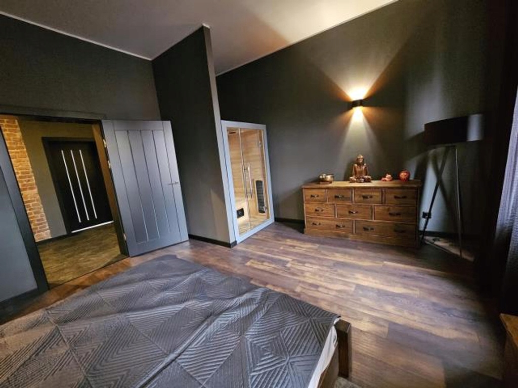 Lokal składa się z pokoju dziennego/salonu, przestronnej jadalni połączonej z obszerną widną kuchnią, wygodnej dużej sypialni z własną sauną, dużego pokoju, wygodnej garderoby, gabinetu, głównej łazienki z wanną, prysznicem, toaletą, bidetem pralką i suszarką, drugiej mniejszej łazienki z wc i prysznicem, pomieszczenia siłowni z zabudowanymi szafami, pomieszczenia gospodarczego/komórki oraz reprezentacyjnego hallu/przedpokoju.