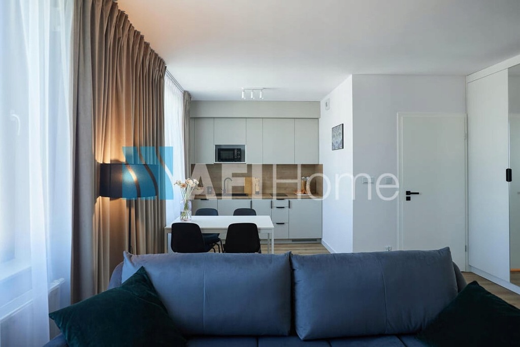 Modern, fully furnished studio apartment in a newly built (2023) residential building at Karola Bunscha 15, located in the popular Osiedle Europejskie. The kitchenette includes a fridge, induction hob, and microwave. The bathroom is fitted with a walk-in shower and washing machine. The living area comes with a sofa bed and dining table. Large windows provide plenty of light and views of the well-maintained green areas surrounding the building.Large, soundproof windows provide lots of natural light and acoustic comfort.