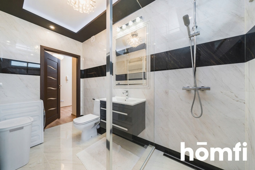 - Łazienka: duży prysznic, WC, umywalka, szafa, pralka.