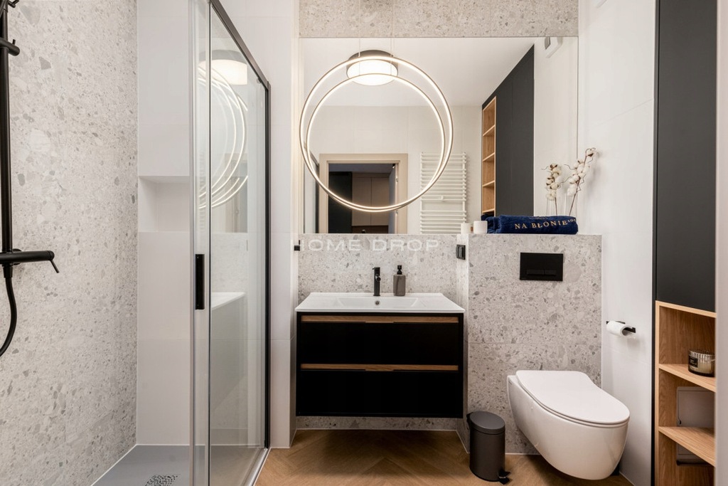 • łazienki z prysznicem i zabudową meblową.