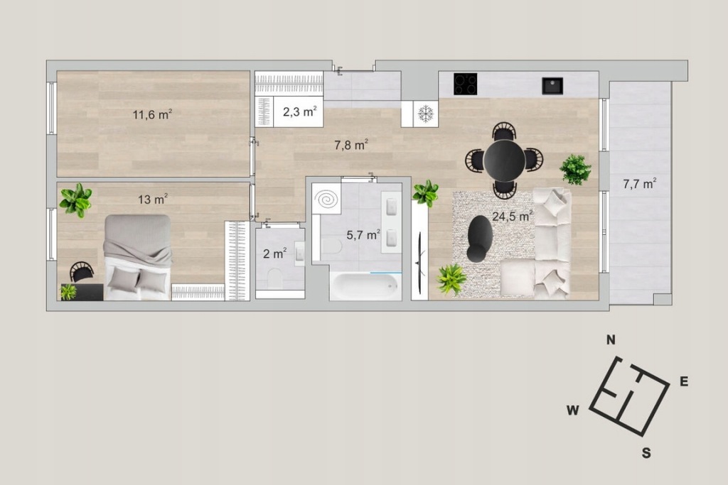 - Balkon: 7,7 m²