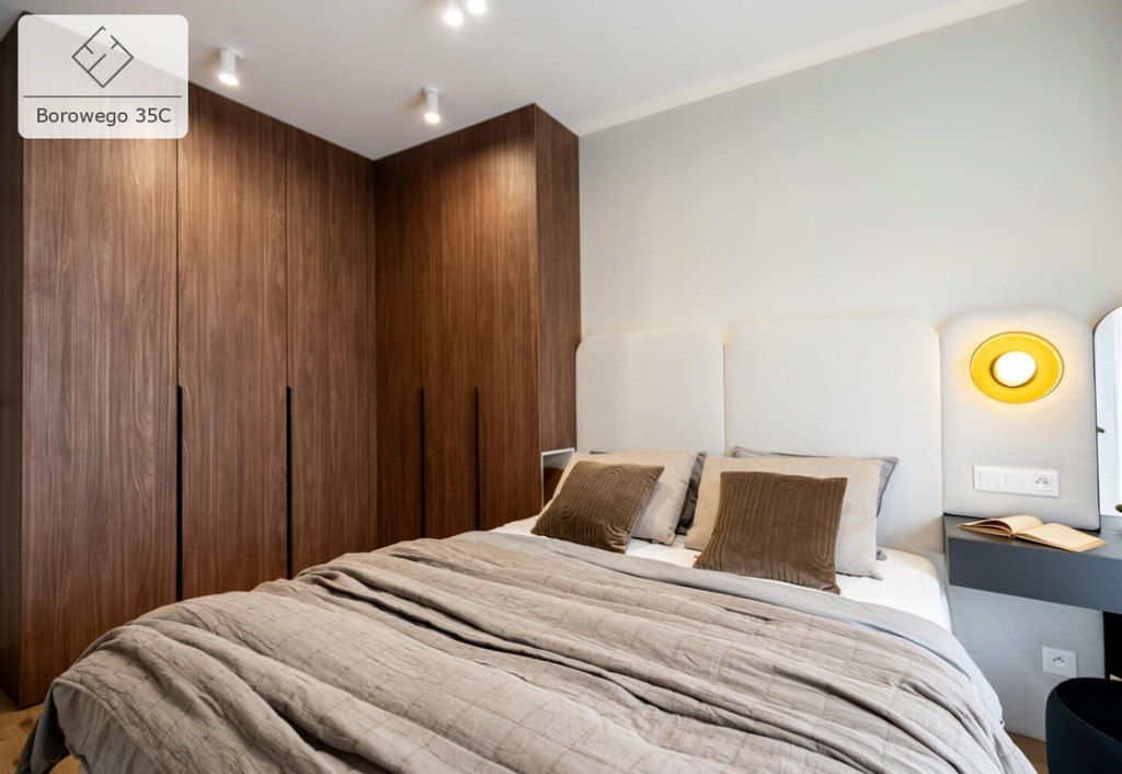 - Sypialnia 1 (13 m²) z podwójnym łóżkiem i szafkami nocnymi oraz pojemnymi szafami w zabudowie.