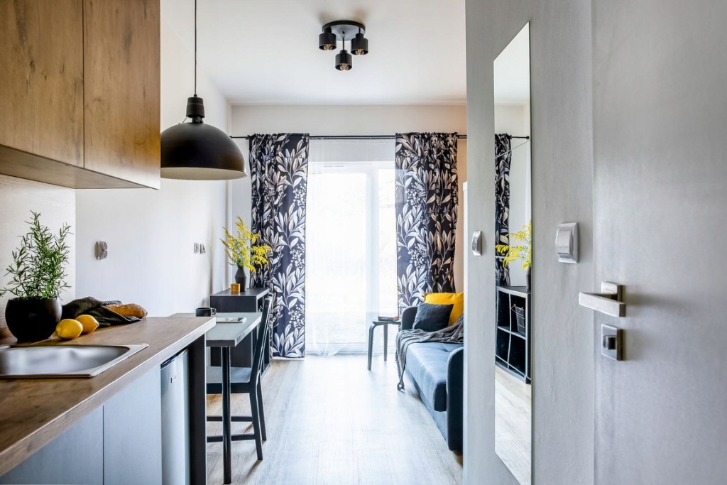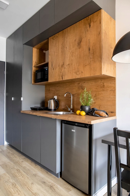 Mieszkanie wyposażone: pralka, lodówka, mikrofalówka, kuchenka indukcyjna, czajnik elektryczny, router
