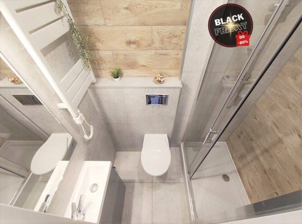 *Łazienka razem z WC: umywalka z półką na przybory toaletowe, lustro, kabina prysznicowa, podtynkowe WC.