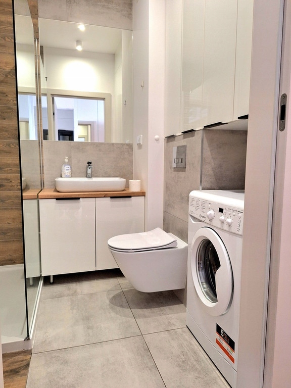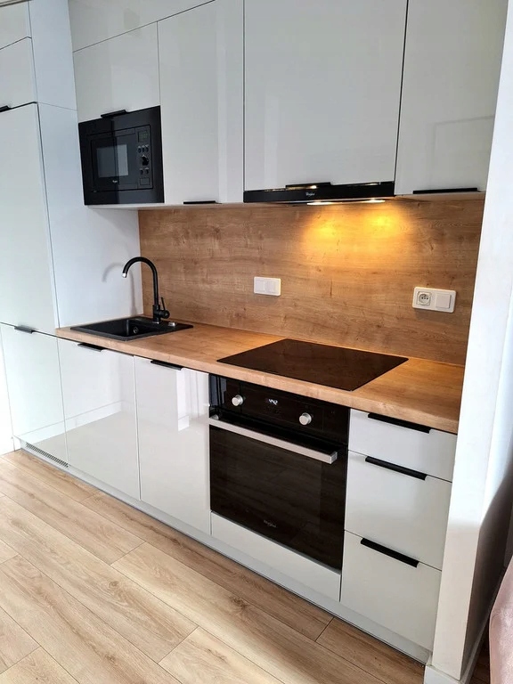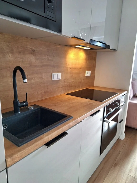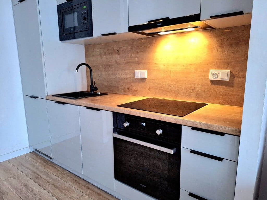 Mieszkanie wyposażone we wszystkie niezbędne sprzęty: duża lodówka, zmywarka, płyta indukcyjna 4 -palnikowa, piekarnik, mikrofala, pralka i telewizor.