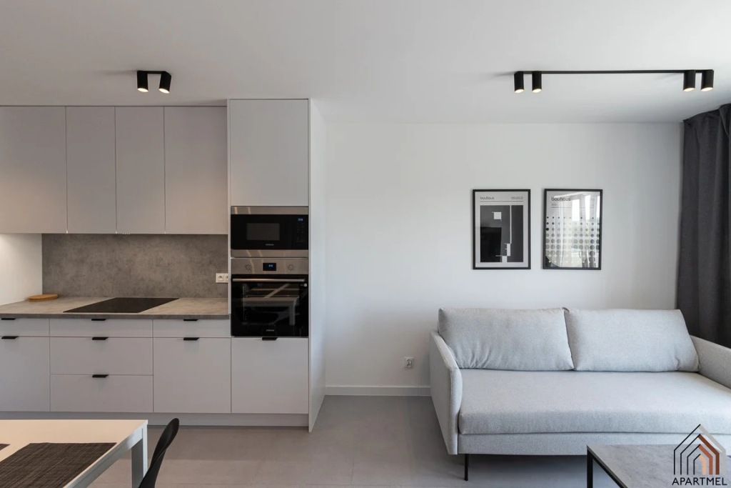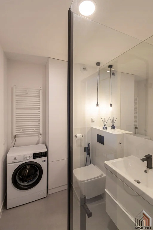 Dodatkowo mieszkanie wyposażone jest w zestaw startowy z podstawowymi środkami czystości do kuchni i łazienki, środkami do czyszczenia mebli i podłóg, w tym worki do odkurzacza, wodę demineralizowaną do żelazka, sól do zmywarki, zmiękczacz wody do pralki.