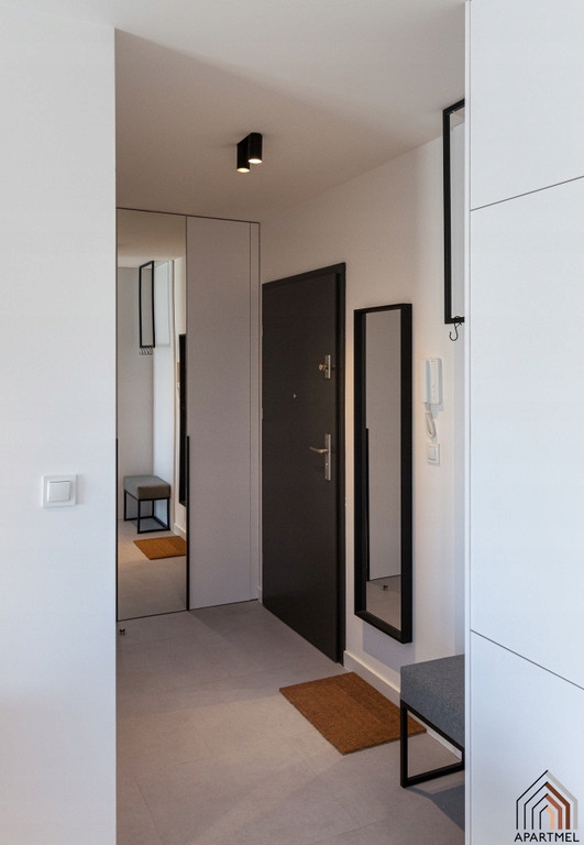 Strefa wejściowa z szafą ubraniową z wieszakami oraz gospodarczą wyposażona w odkurzacz, rozkładaną suszarkę, deskę do prasowania, żelazko oraz mop. Dodatkowo ławeczka, podręczny wieszak oraz duże lustro w skrzydle szafy.