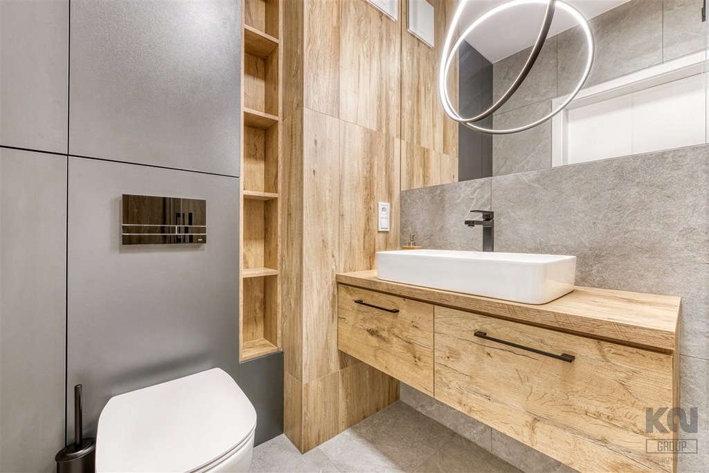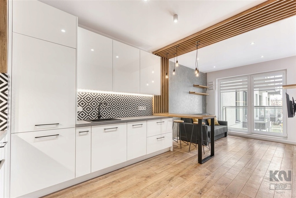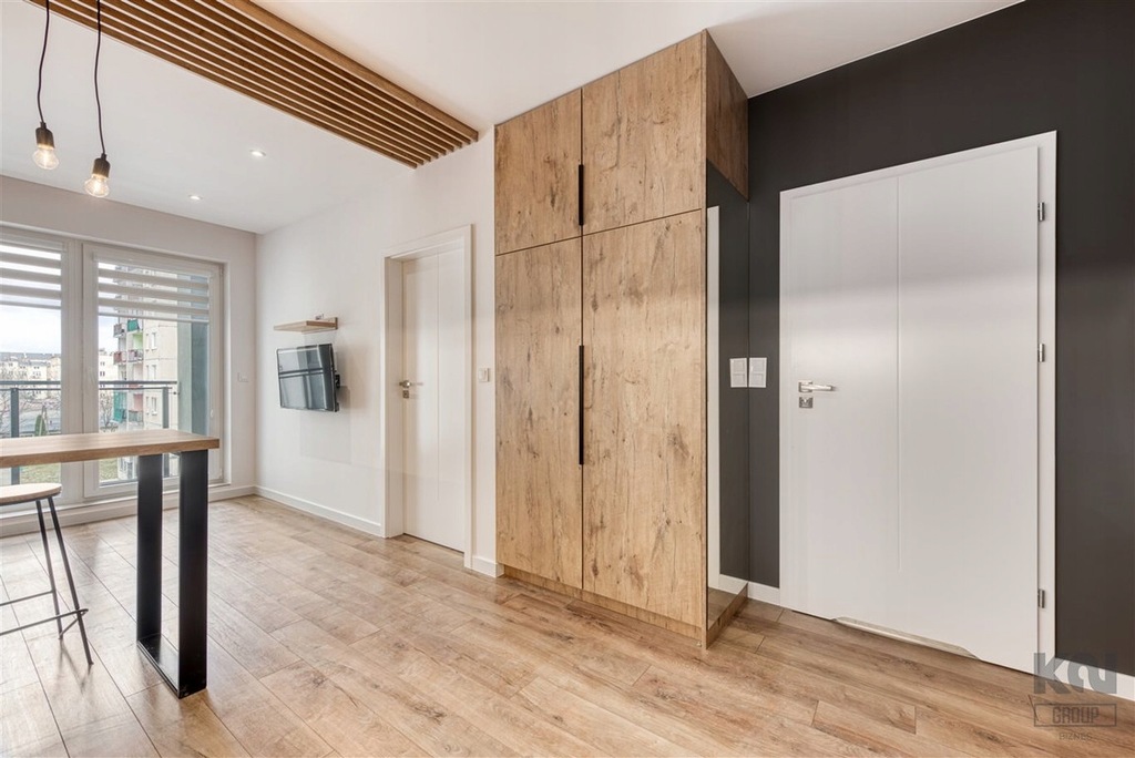 Wysoki standard wykończenia wnętrz oraz funkcjonalny układ apartamentu stanowią niewątpliwe atuty oferty.