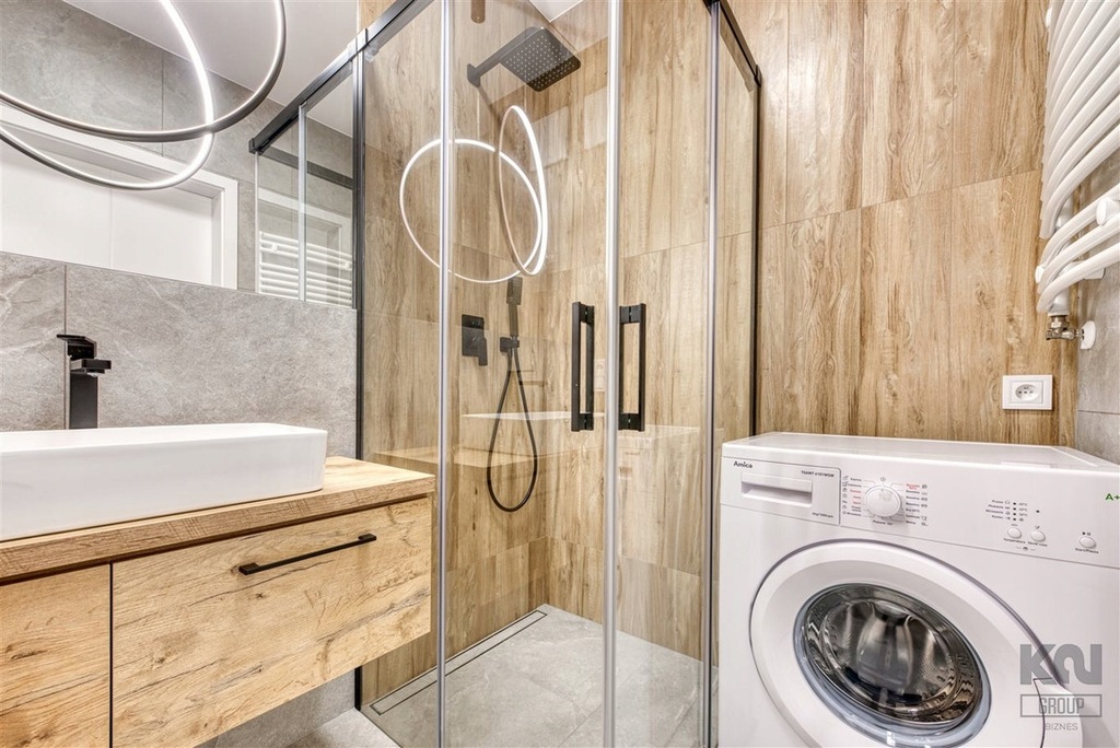 - nowoczesną łazienkę z WC wyposażoną w prysznic oraz pralkę;