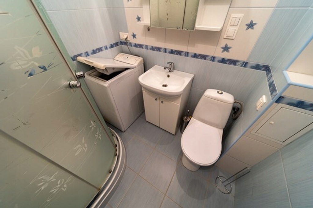 Łazienka: kabina prysznicowa, pralka, umywalka, WC.