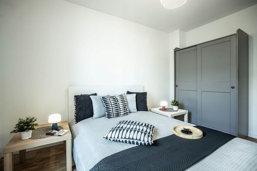 - Duża, komfortowa sypialnia z pojemnym łóżkiem i szafą,