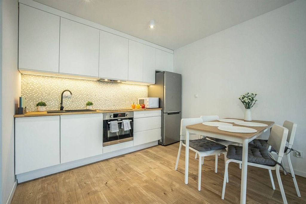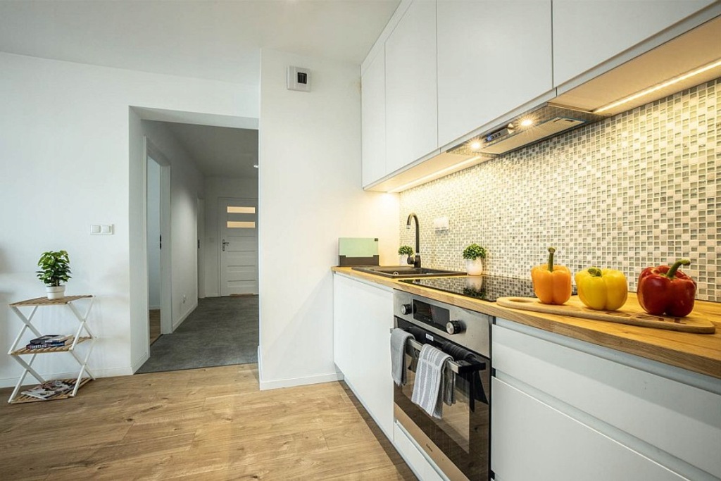 - Aneks kuchenny w pełni wyposażony: lodówka, piekarnik, płyta indukcyjna, zmywarka, okap.